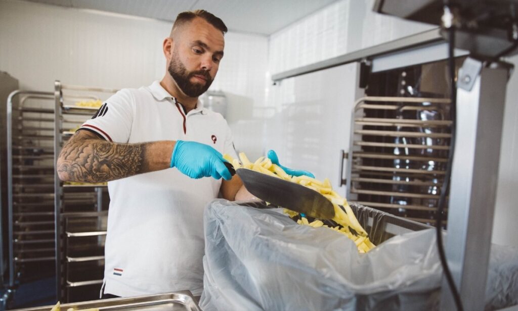 Kevin vervolgt: ‘Door de enorme kennis en expertise die erin zit. De perfecte friet maken, is niet zo simpel als het lijkt. Dat staat of valt allereerst écht met de goede aardappel. En bij elke keuze, maken we een kwaliteitsoverweging. Ter illustratie: voorgebakken friet met schil líjkt misschien gezonder – maar wij denken daar anders over. Een schil is met van alles en iedereen in aanraking geweest, onder de schil zitten wellicht beurse plekken en dan heb ik het nog niet eens gehad over het (giftige red.) laagje solanine onder de schil wat dan blijft zitten. Dus wij schillen onze friet bewust én in een andere ruimte dan waar het wordt gebakken. Voor een maximale kwaliteit en hygiëne.’
